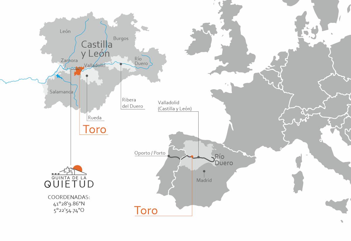 Die Quinta de la Quietud wurde im Jahre 1999 von einem unternehmerischen Freundeskreis aus Wein-Enthusiasten aus Barcelona und Valladolid gegründet und weist 22 Hektar Land auf. Darauf wächst zu 98% die Sorte Tinta de Toro, eine Spielart des Tempranillo, angebaut als wie der Name schon sagt buschig wachsender, minimal erzogener 'bush-vine'. Die restlichen 2% der Rebfläche teilen sich Palomino, Verdejo, Moscatel, Malvasía und Albillo, aus denen ein ungewöhnlicher Strohwein erzeugt wird, der z.B. als Dessertwein genossen werden kann.