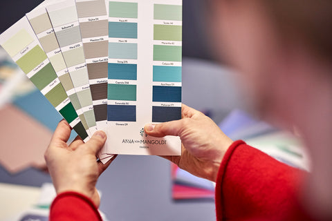Anna von Mangoldt Farben werden auftragsbezogen produziert – so erhalten Sie genau die Menge, die Sie brauchen, in Ihrer Wunschfarbe. Wir halten aber auch eine kleine Auswahl an Farben und Mustern für Sie bereit.