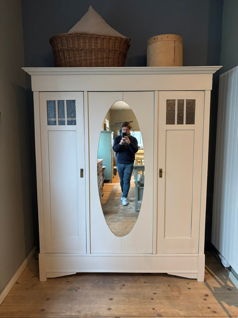 Dieser alte Steckschrank ist ein Möbel mit Haltung. Groß, ruhig und funktional – und dabei alles andere als schwer. Seine klare Dreiteilung, der neu eingesetzte Spiegel in der mittleren Tür und die zurückhaltende Farbgebung machen ihn zu einem Stück, das Räume ordnet, ohne sie zu dominieren.