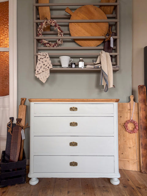 Diese charmante Weichholz-Kommode wurde in „Lake Whisper Green“ (matte Kreidefarbe von Paint of Walinoon) gestrichen – einem sanften, ruhigen Weiß mit grünem Untertonn. Die Farbe wirkt weich, zurückhaltend und natürlich zugleich. Sie bringt Frische in den Raum, ohne kühl zu erscheinen. Je nach Lichteinfall wirkt sie grüner. Eine bemerkenswerte Farbe.